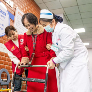 11月6日,在长沙市望城区高塘岭街道中南社区,志愿者及医务人员帮助行动不便的居民(中)使用康复器具。