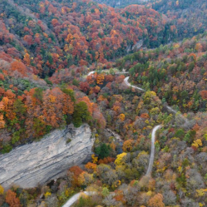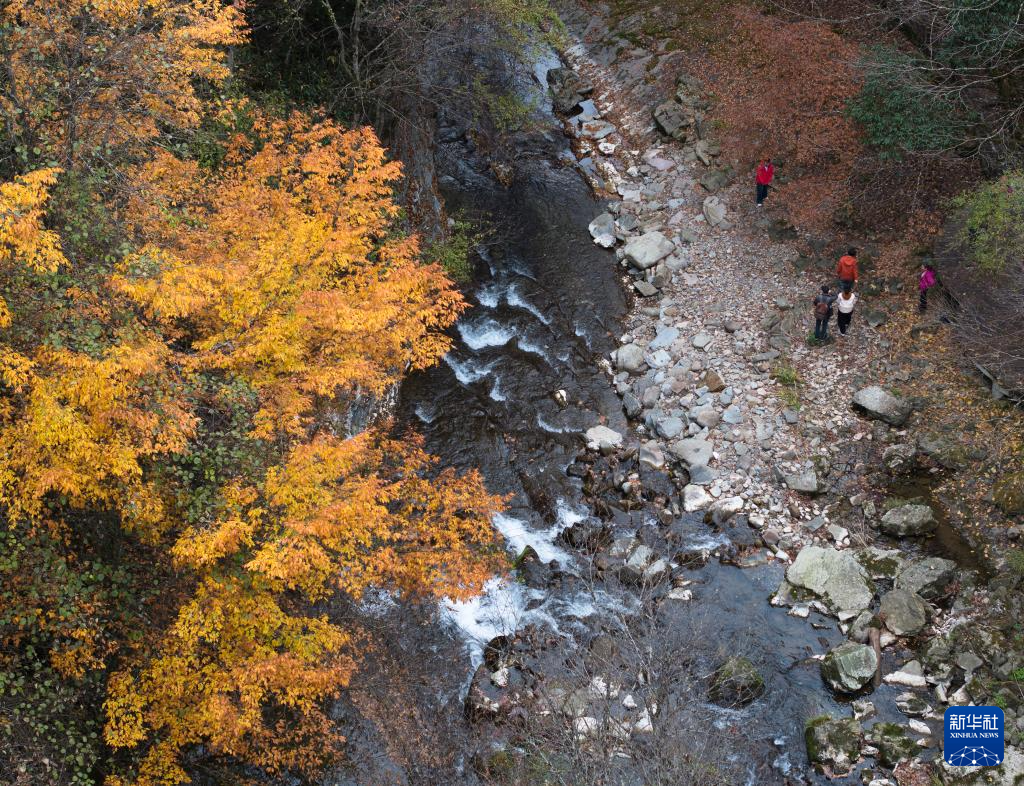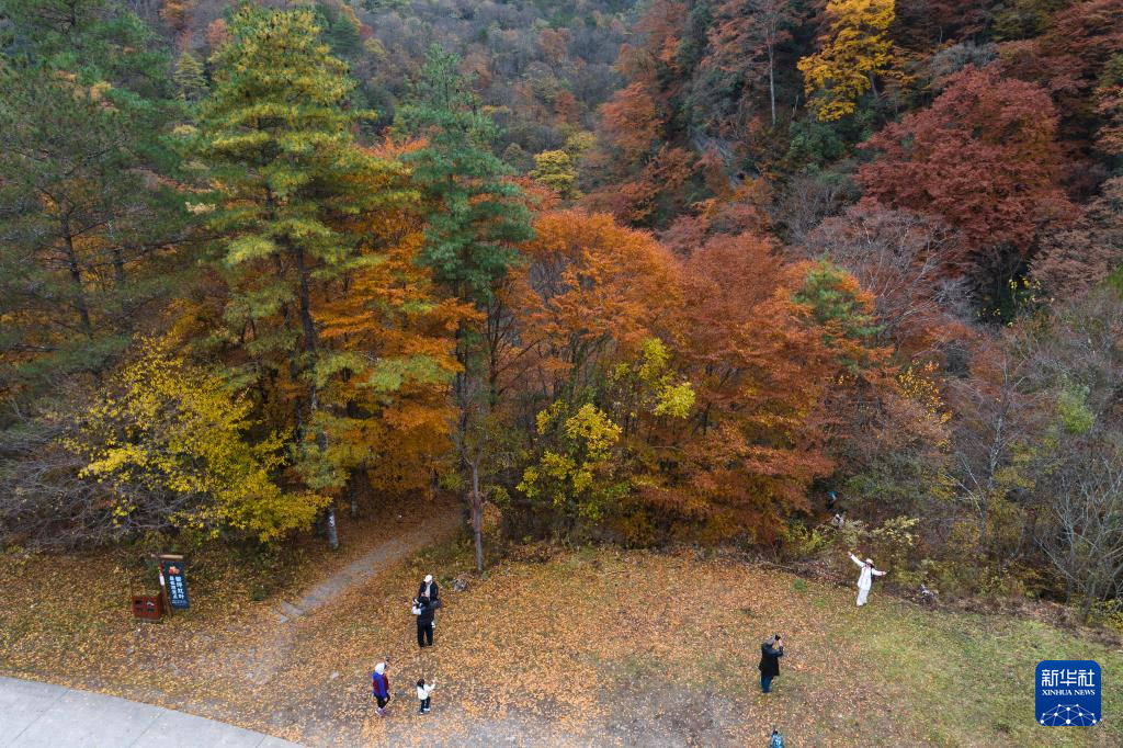 11月5日,游人在位于汉中市南郑区的黎坪国家森林公园内拍照游玩(无人机照片)。