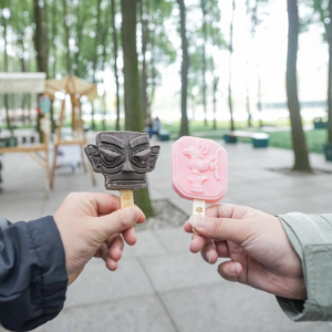在四川省广汉市三星堆博物馆,两名游客在展示文创雪糕产品(10月30日摄)。