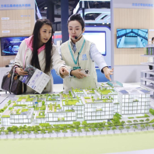 11月6日,讲解员(右)在住博会上向观众介绍展出的节能建筑。