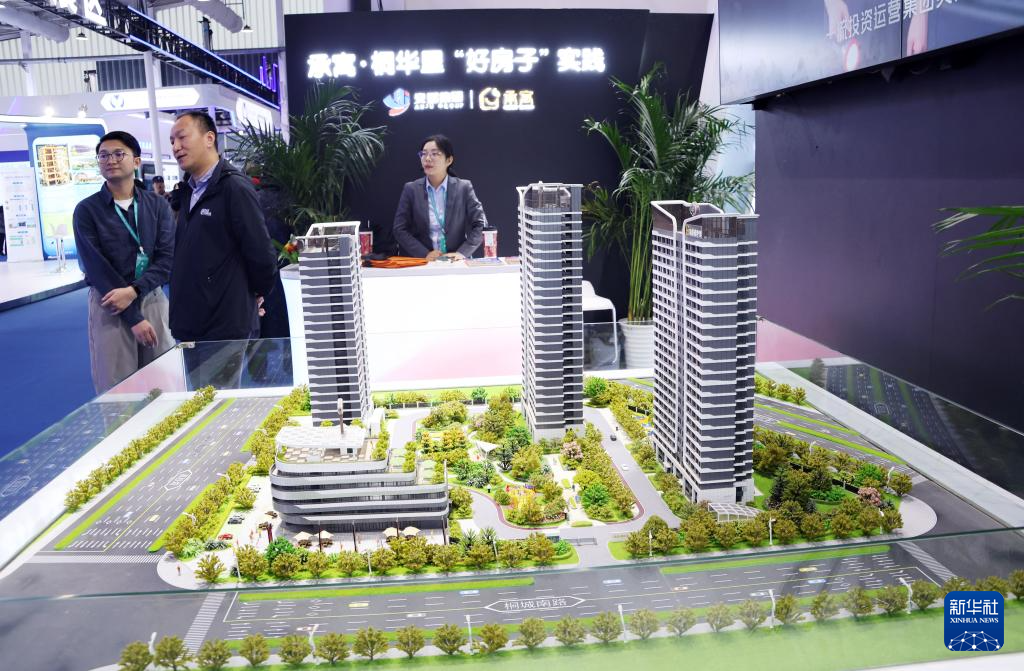 11月6日,参观者在住博会上观看展出的一体化民居模型。