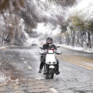 11月6日,在乌鲁木齐市红山路,一名外卖员在雪中骑行。