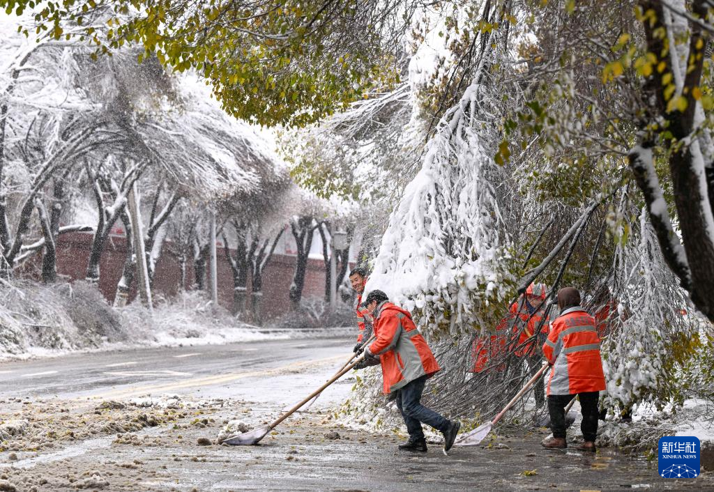 11月6日,工作人员在乌鲁木齐市水磨沟区的一处公园里清雪。