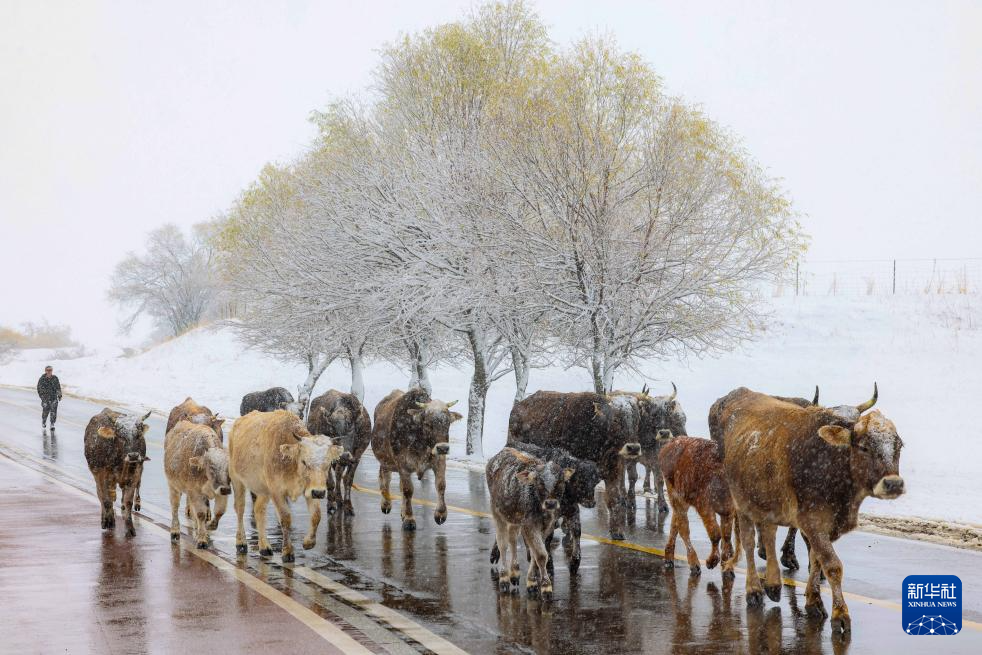 11月5日,牧民赶着牛群走在大雪中的新疆伊犁哈萨克自治州新源县那拉提景区。