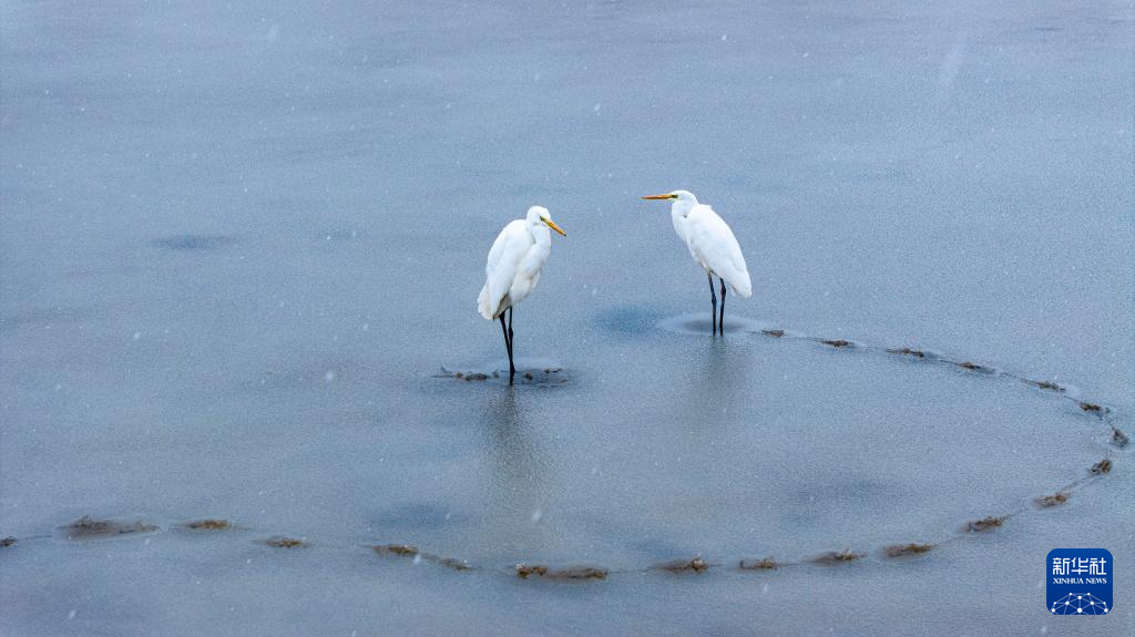 11月6日,在新疆木垒县守静园,两只白鹭站在雪中(无人机照片)。