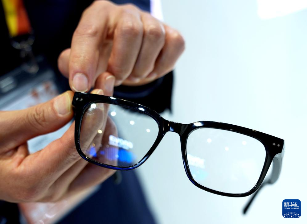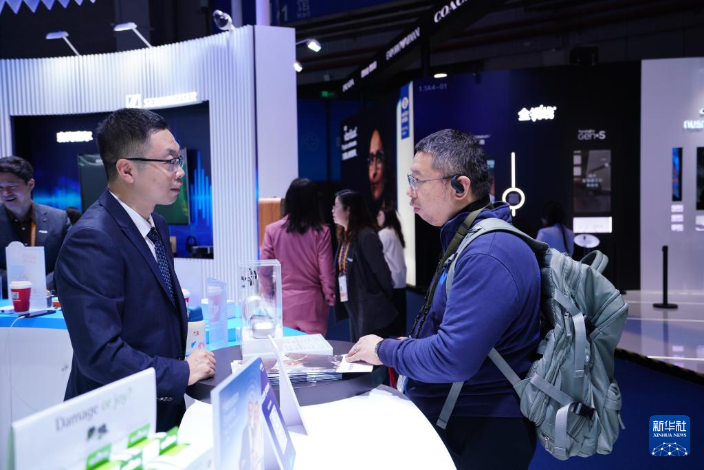 11月6日在进博会医疗器械及医药保健展区拍摄的智能助听眼镜。它将开耳式听力技术集成到眼镜,适合听力为轻度至中度损失的老年人。