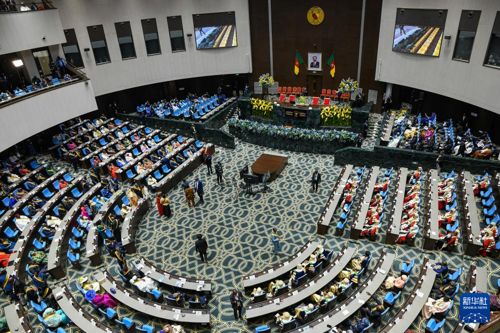 这是11月6日在喀麦隆首都雅温得的国民议会大楼内拍摄的总统宣誓就职仪式现场。