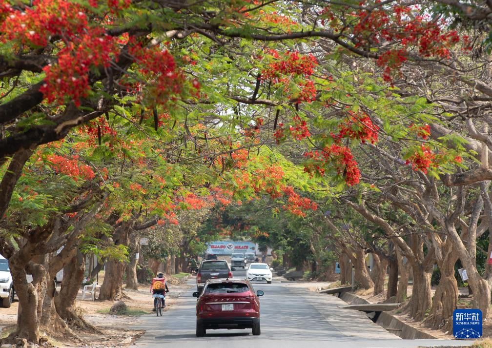 这是11月2日在赞比亚首都卢萨卡拍摄的盛开的凤凰木。