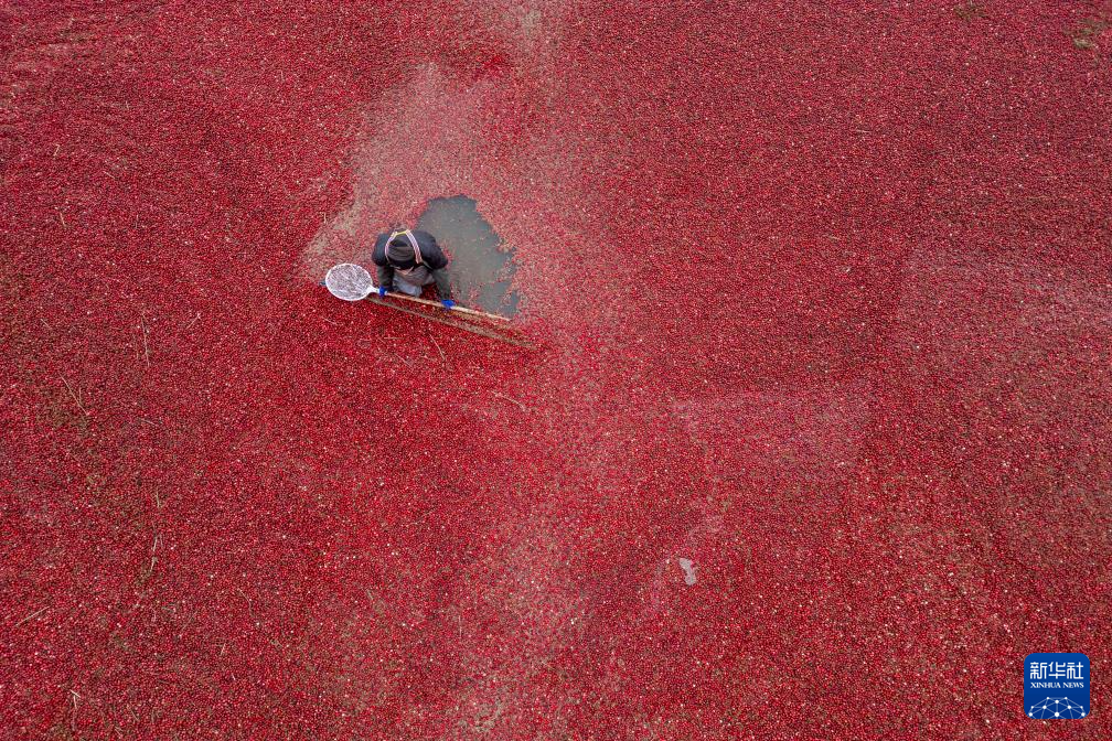 11月6日,在抚远市蔓越莓种植基地,工作人员在水中采收蔓越莓(无人机照片)。