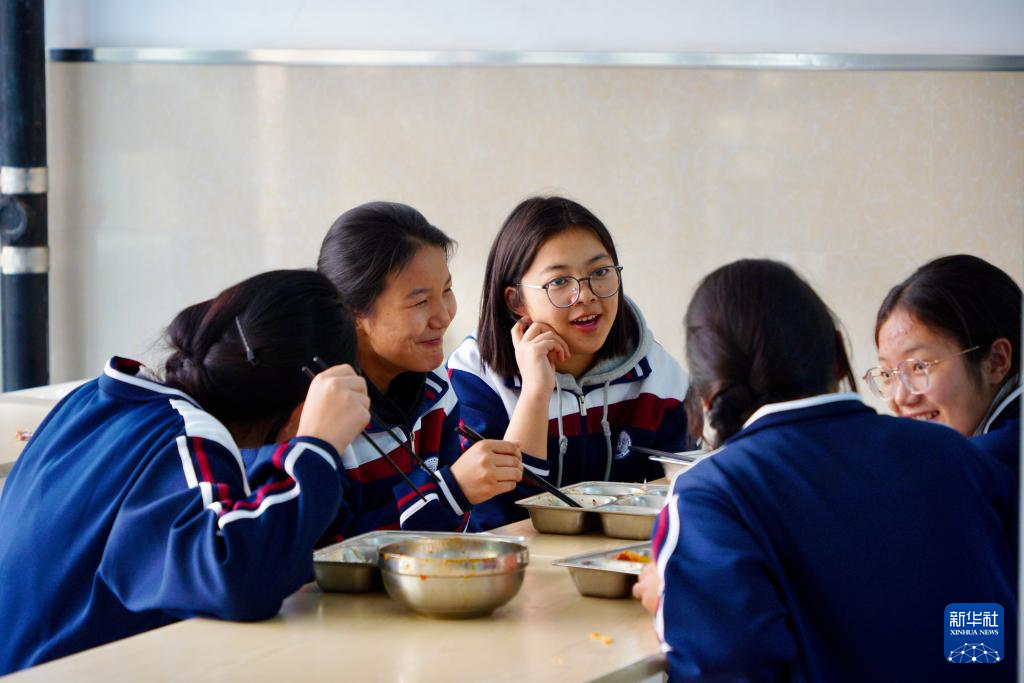 11月7日,在青海省西宁市果洛西宁民族中学,学生在食堂吃午饭。