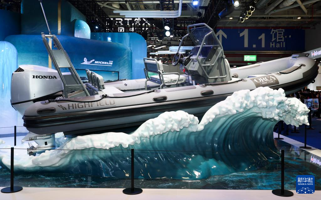 11月8日在第八届进博会汽车及智慧出行展区米其林展位拍摄的使用复合涂层材料的刚性充气艇。