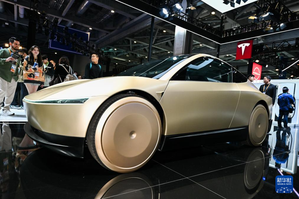 11月8日,在第八届进博会汽车及智慧出行展区特斯拉展位,观众在参观特斯拉赛博无人驾驶电动车。