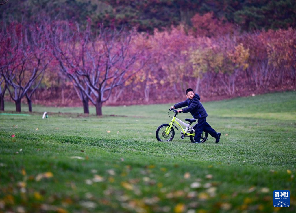 11月8日,一个小朋友推着单车走在北京雁栖湖畔的草坪上。