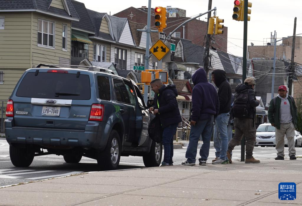 11月7日,在美国纽约一处街头零工市场,一名劳工被雇主雇用。