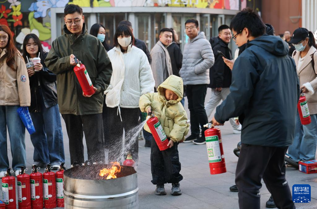 11月9日,在沈阳市中街商业步行街,市民参加灭火演练。