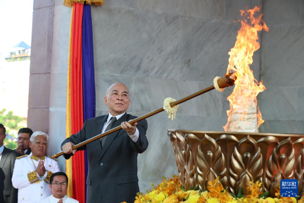 11月9日,在柬埔寨首都金边,柬埔寨国王西哈莫尼点燃独立纪念碑的“胜利之火”。