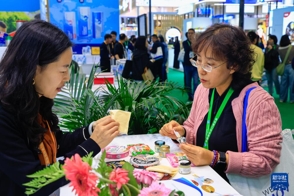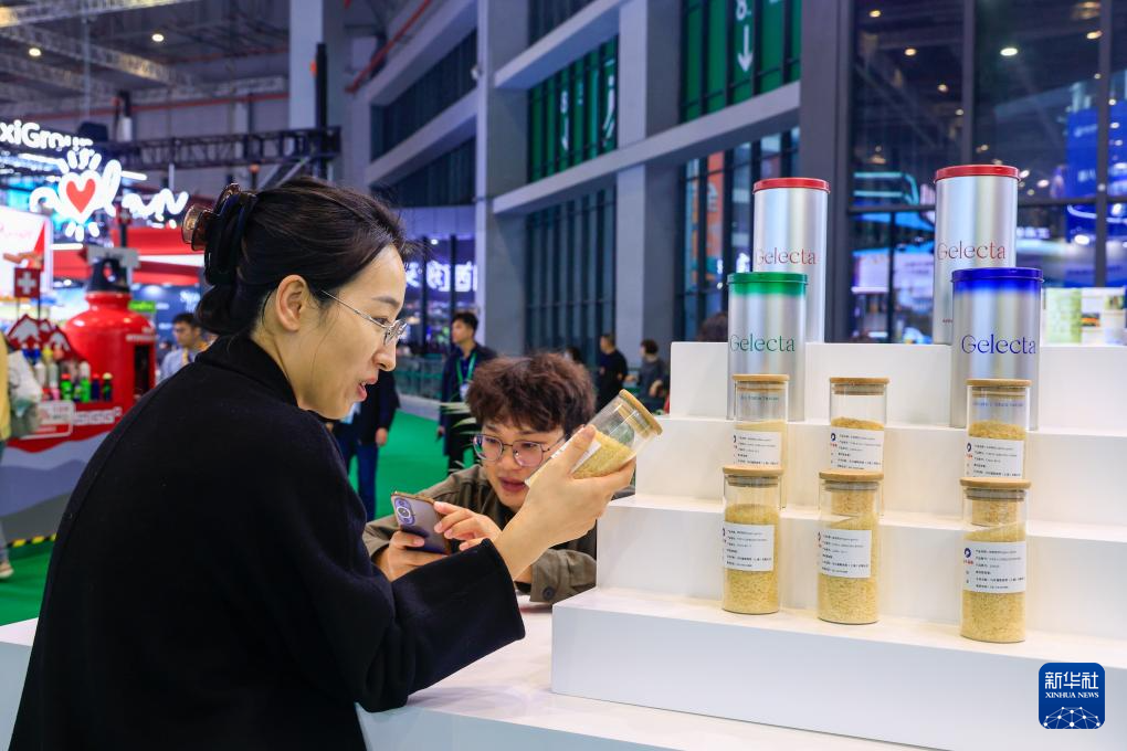 11月8日,在第八届进博会农食产品展区伊塔格尔公司(Italgel)展台,参观者(左)在了解明胶产品。