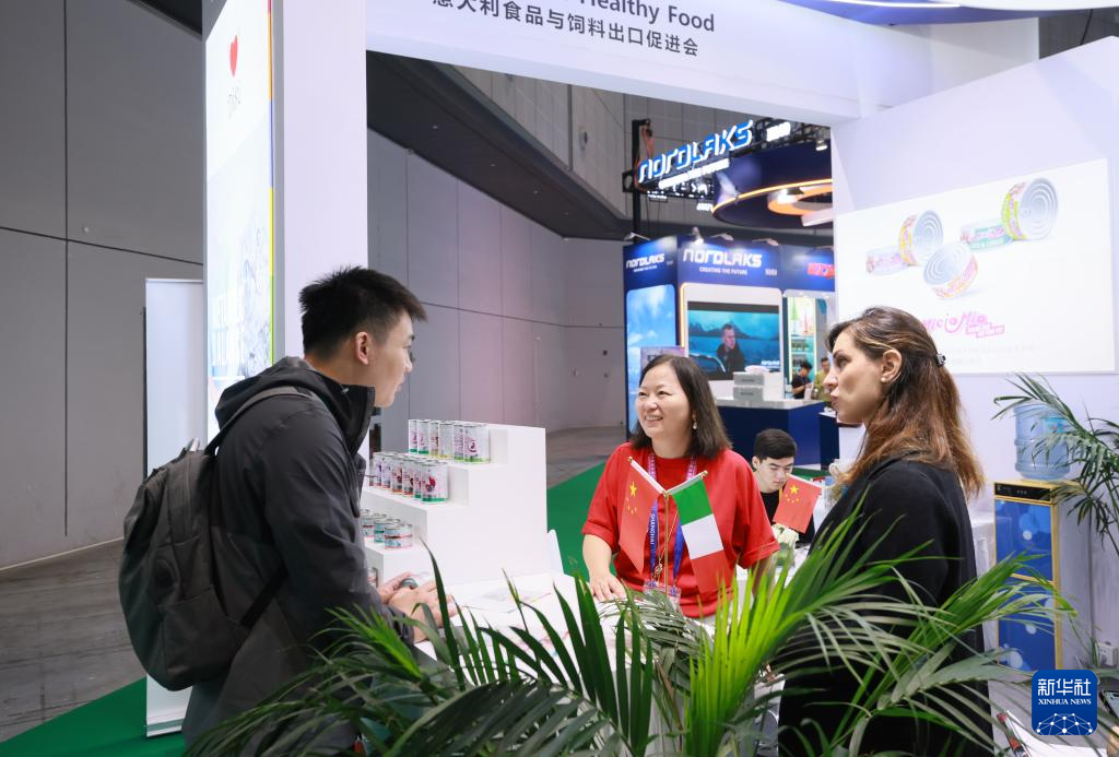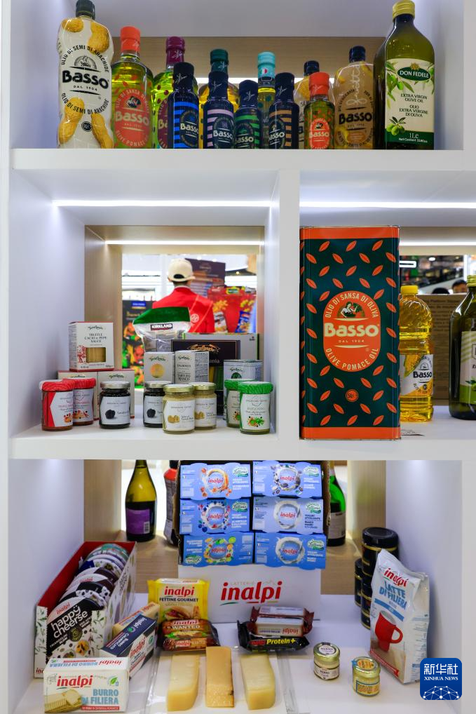这是11月9日在第八届进博会农食产品展区拍摄的意大利食品与饲料出口促进会展台一角。