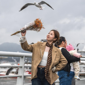 11月10日,游客在云南省昆明市海埂大坝投喂红嘴鸥。