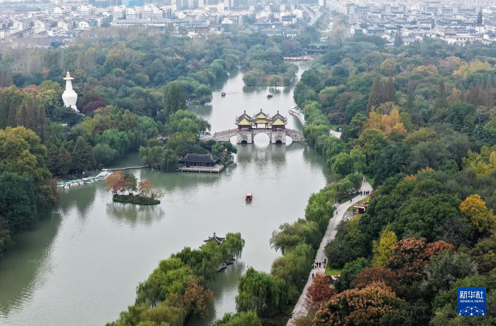 11月12日拍摄的江苏扬州瘦西湖风景区初冬景色(无人机照片)。