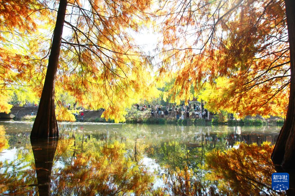 11月12日,游客在南京莫愁湖公园赏景游玩。
