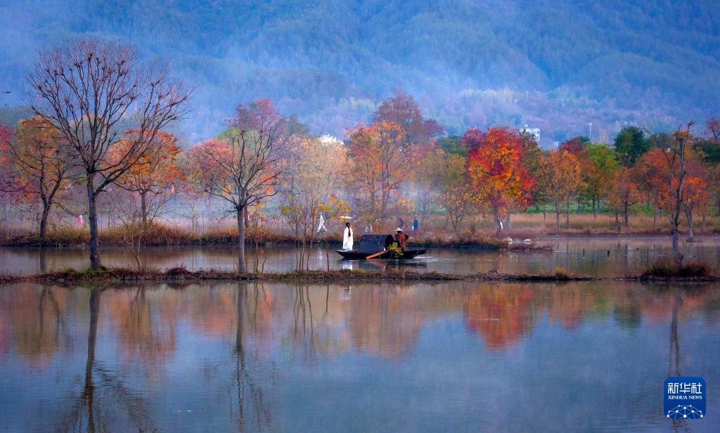 11月12日,在湖北省黄冈市罗田县九资河镇河西畈村,游客乘坐小木船观赏红叶。