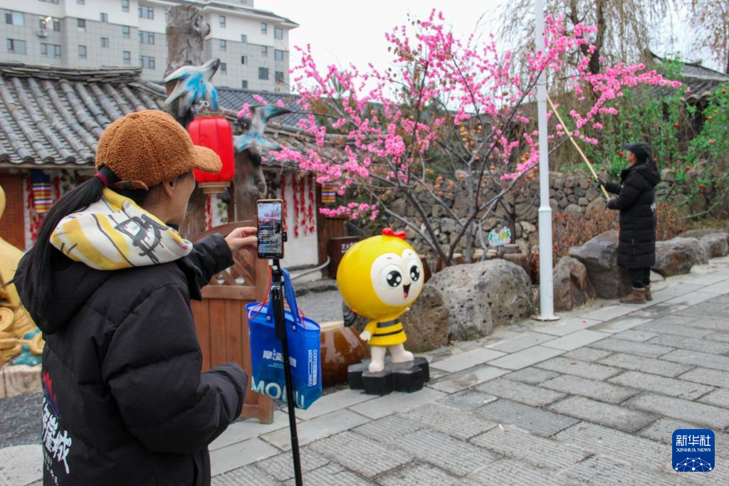 11月4日,在吉林省白山市长白朝鲜族自治县千年崖城景区,工作人员直播介绍景区特色。