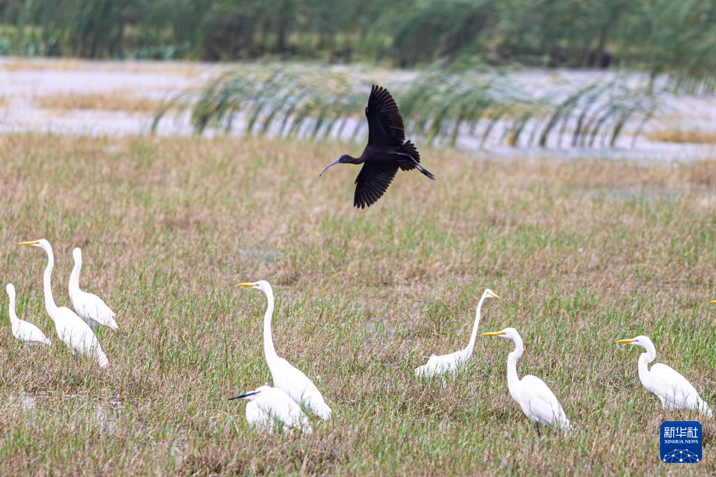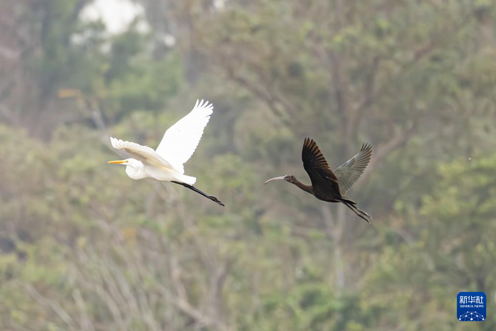 彩鹮(右)与鹭鸟在海南昌江海尾国家湿地公园齐飞(11月5日摄)。