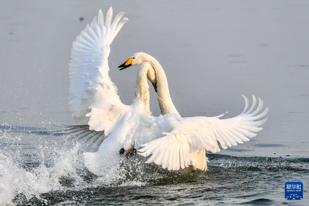 11月13日,白天鹅在山西平陆黄河湿地嬉戏。