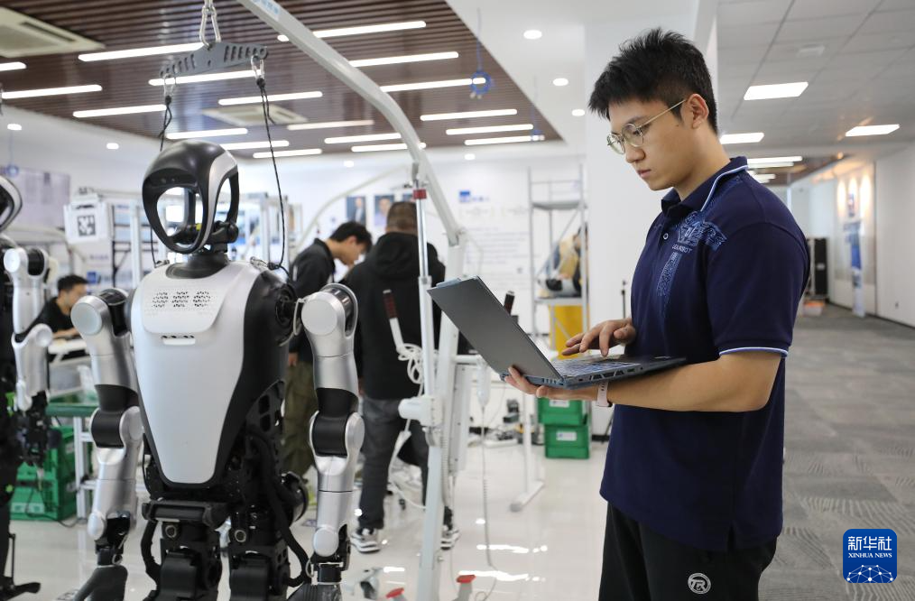 10月24日,张鸿伟操控人形机器人,准备进行测试。新华社记者 杜潇逸 摄