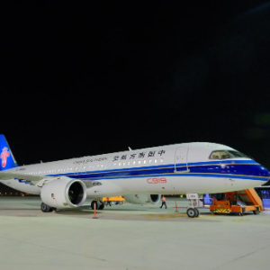 这是11月14日凌晨在阿联酋迪拜阿勒马克图姆国际机场拍摄的一架中国南方航空C919飞机。