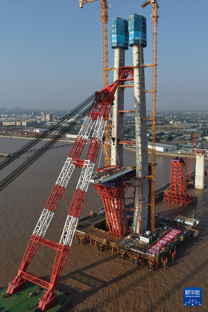 11月15日拍摄的杭州湾跨海铁路桥北航道桥钢梁架设现场(无人机照片)。