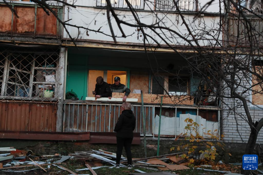 11月14日,在乌克兰首都基辅市第聂伯区,当地居民对遭受空袭损毁的房屋进行修缮加固。