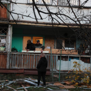 11月14日,在乌克兰首都基辅市第聂伯区,当地居民对遭受空袭损毁的房屋进行清理。