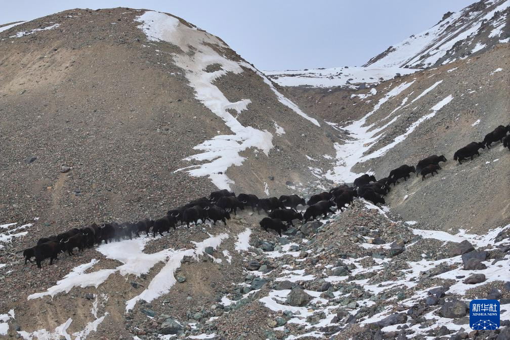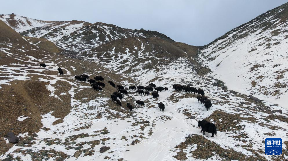 11月14日,国家一级保护野生动物野牦牛在甘肃省阿克塞县阿勒腾乡哈尔腾草原的雪山上转场迁徙(无人机照片)。