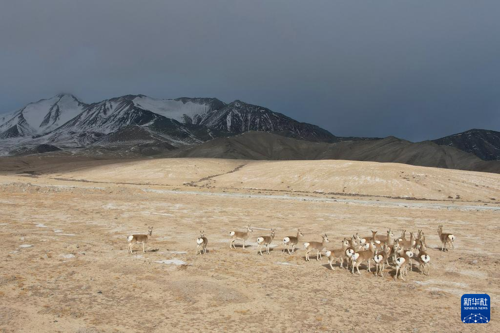 11月14日,国家二级保护野生动物藏原羚在甘肃省阿克塞县阿勒腾乡哈尔腾草原活动觅食(无人机照片)。