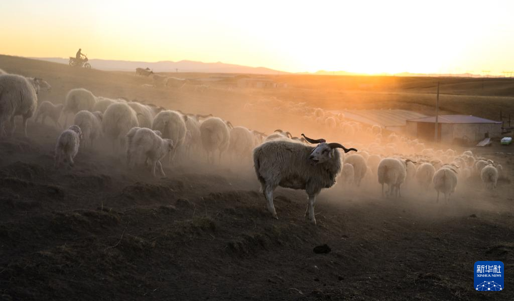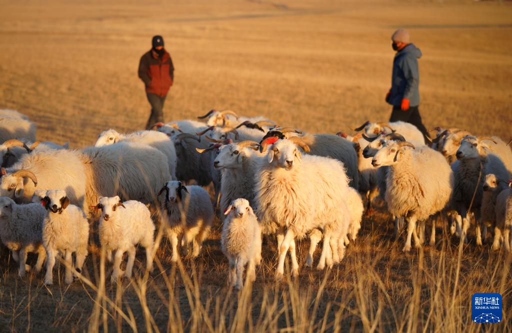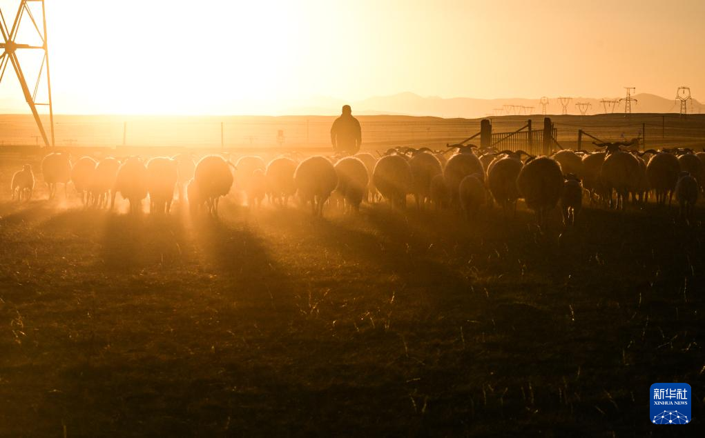 11月13日,在青海省海北藏族自治州刚察县泉吉乡宁夏村草场,牧民将羊群赶回羊圈。