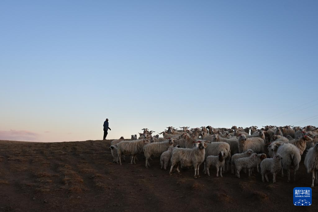 11月13日,在青海省海北藏族自治州刚察县泉吉乡宁夏村草场,牧民才保领着羊群返回圈舍。