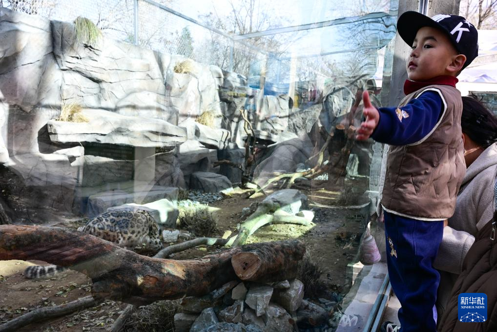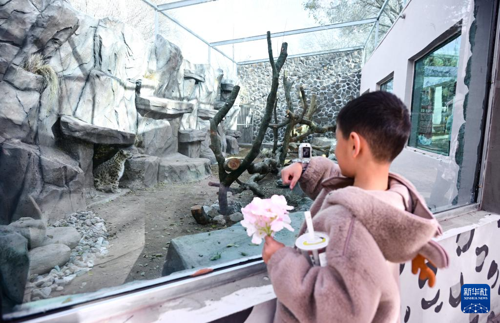 11月15日,在青海省西宁野生动物园,一名小朋友在拍摄雪豹。