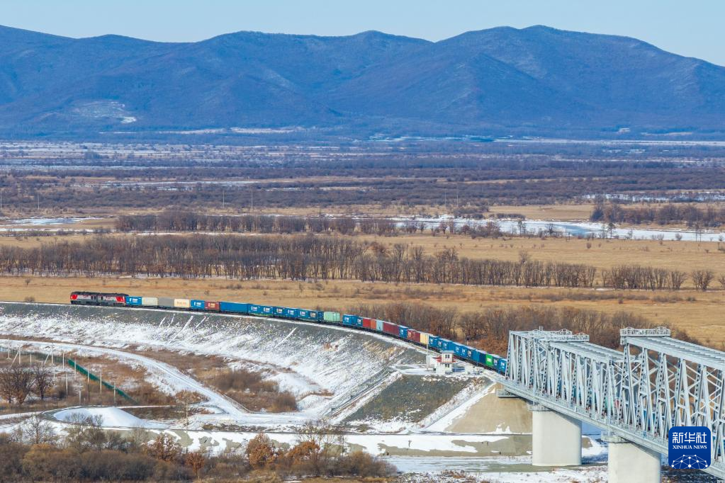 11月15日,中国铁路哈尔滨局集团有限公司同江北站驶出的中欧班列通过同江铁路大桥(无人机照片)。