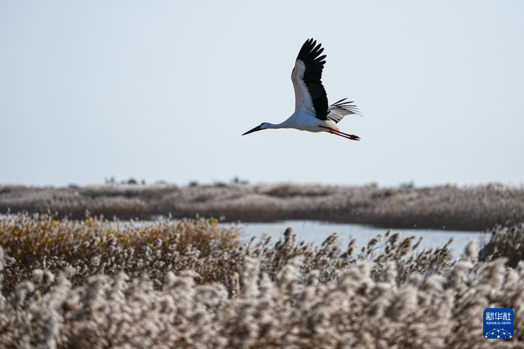 11月13日,山东黄河三角洲国家级自然保护区内,越冬的白鹳在飞翔。