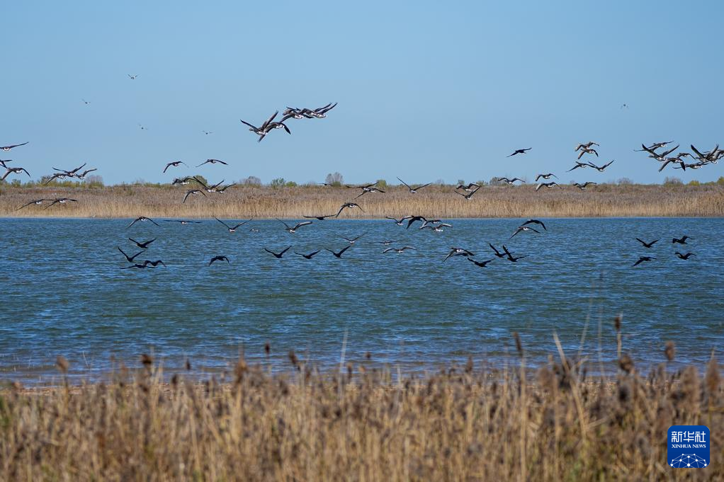 11月13日,山东黄河三角洲国家级自然保护区内,越冬候鸟在飞翔。