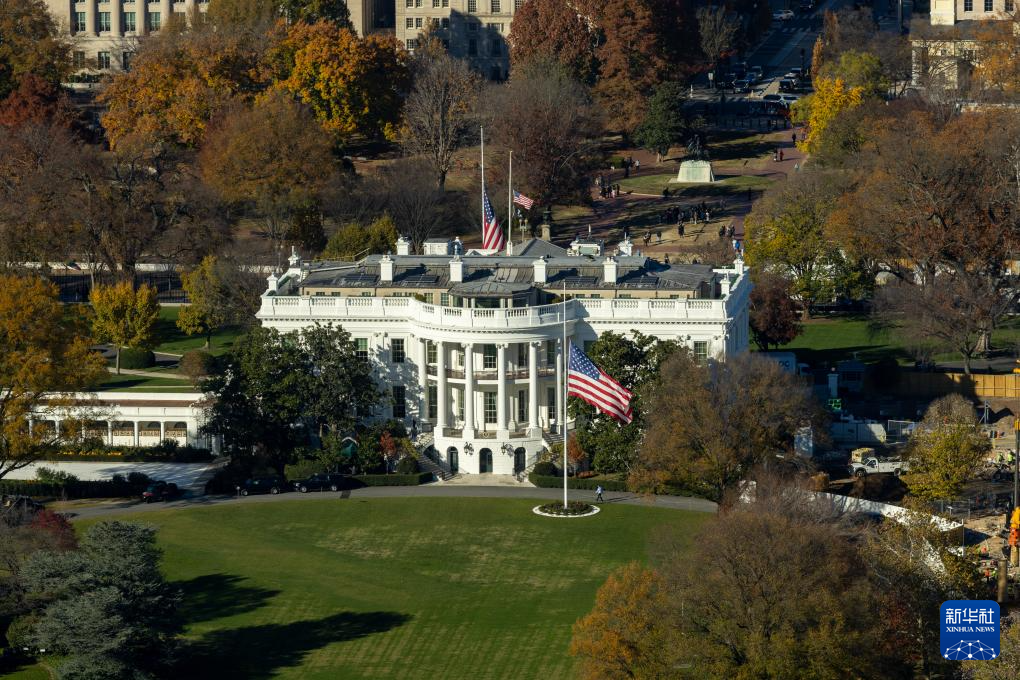 这是11月17日从美国首都华盛顿的华盛顿纪念碑上拍摄的白宫行政官邸和正在施工的东翼。