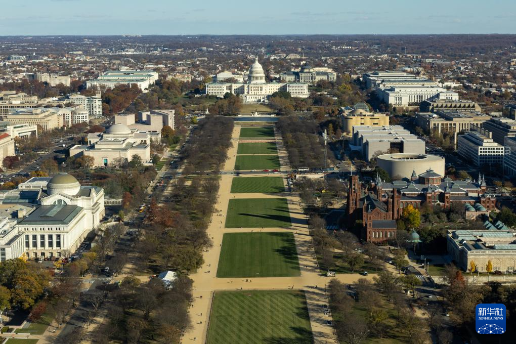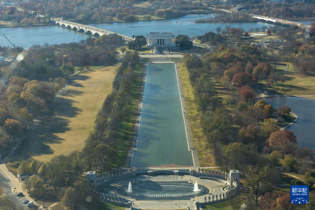 这是11月17日从美国首都华盛顿的华盛顿纪念碑上拍摄的国家广场和林肯纪念堂。