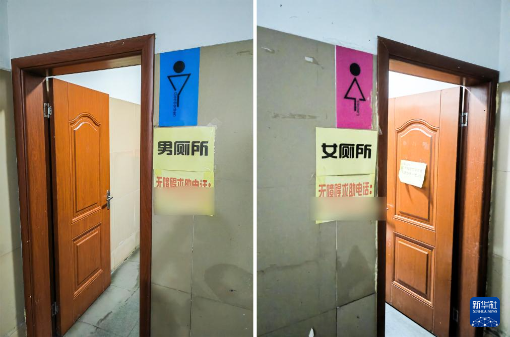 这是11月1日在广西南宁一家酒店内拍摄的公共卫生间,门口只有较小的图形用于分辨性别(拼版照片)。