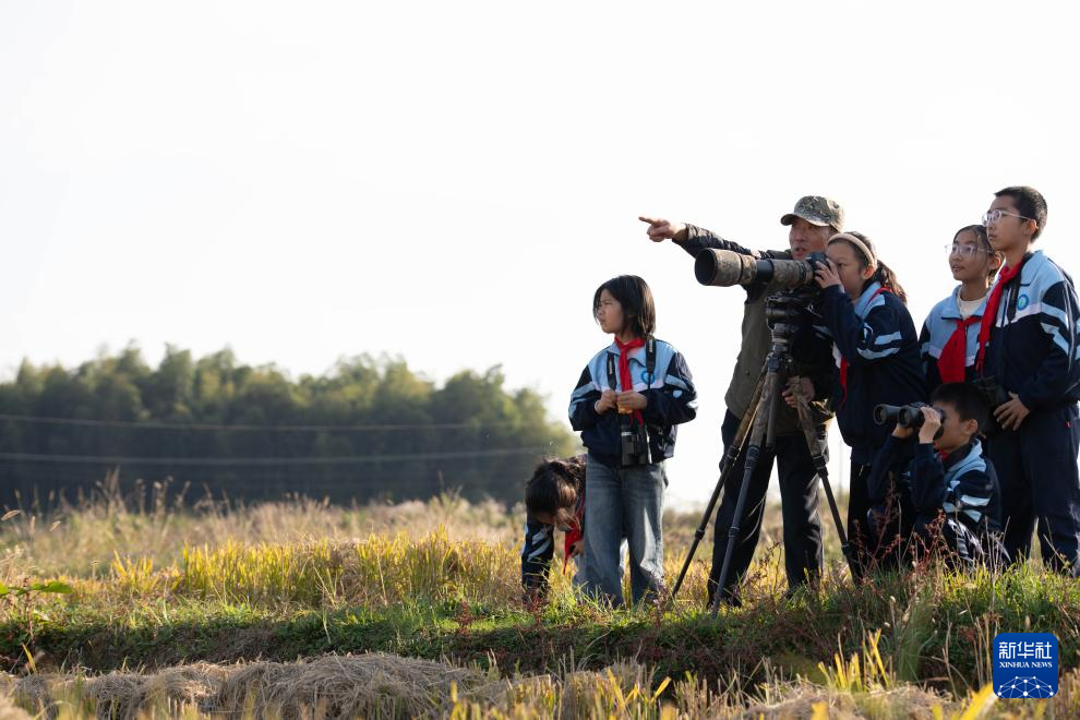 11月18日,在位于安徽省池州市的十八索省级自然保护区,茅坦小学的学生在野生鸟类保护志愿者的带领下观察鸟类。