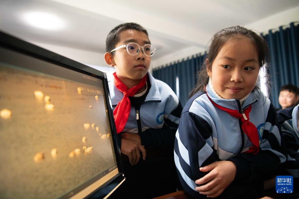11月18日,在位于安徽省池州市的十八索省级自然保护区管理站内,茅坦小学的学生通过监控观看候鸟。