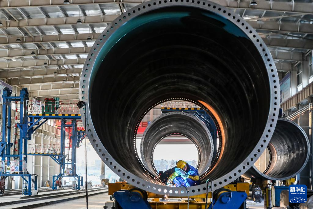 11月20日,在甘肃省酒泉经济技术开发区的中国水电四局(酒泉)新能源装备有限公司塔筒制造车间,工作人员进行风机塔筒焊接作业。