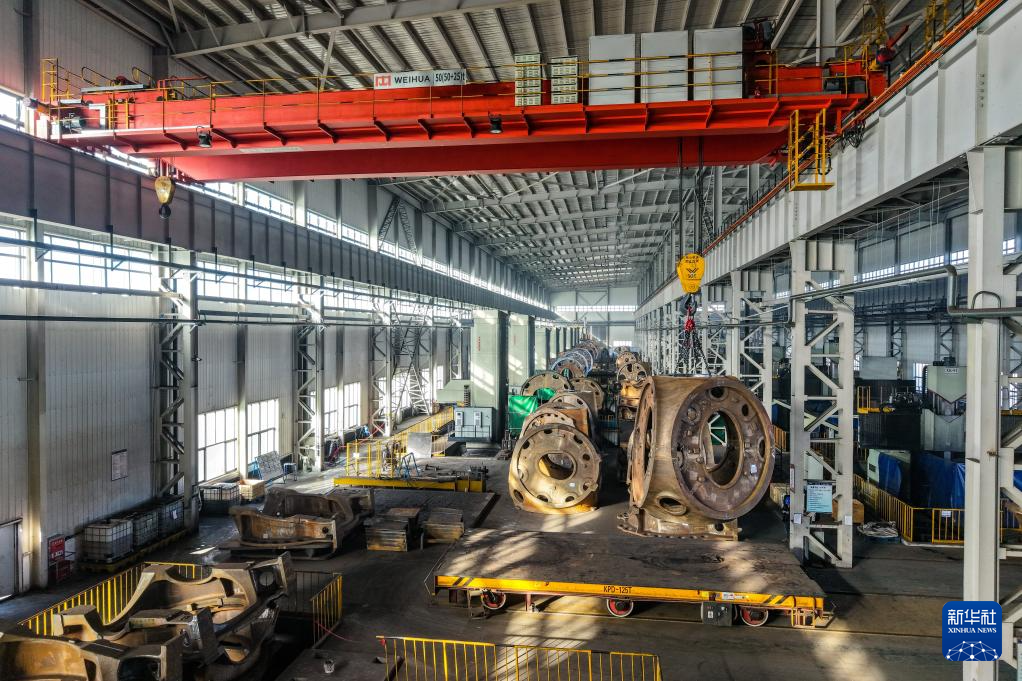 这是11月20日在甘肃省酒泉经济技术开发区日月重工(甘肃)有限公司拍摄的待出厂的风机轮毂(无人机照片)。