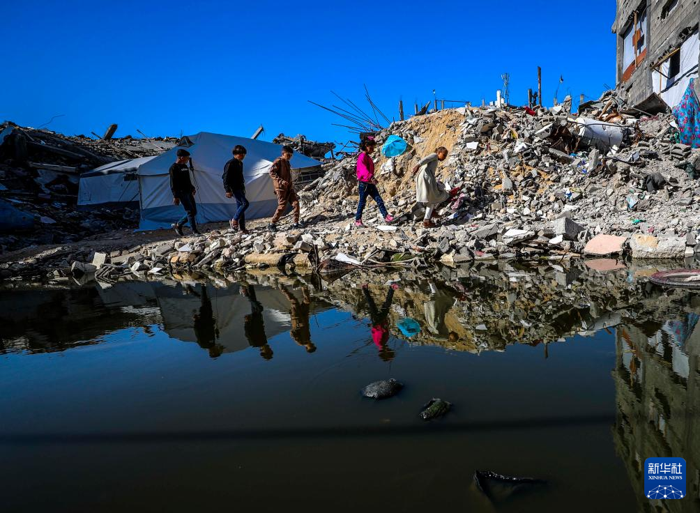 2025年3月31日,在加沙地带北部的杰巴利耶难民营,巴勒斯坦儿童经过一片建筑废墟。